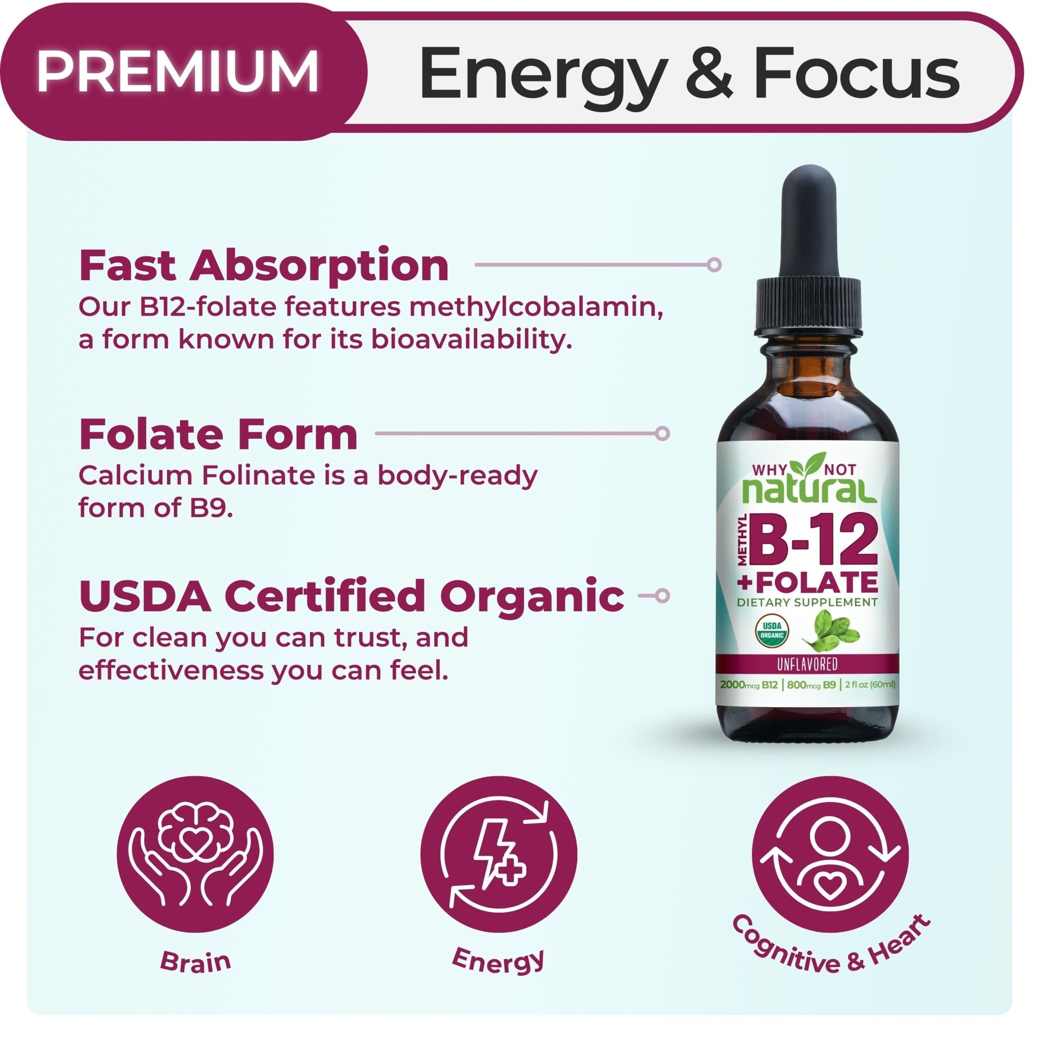 Feel Better, Naturally: Our sublingual organic Vitamin B12 + folate work together for energy, mood, and memory support - they support healthy metabolism, immune system, and nervous system functioning, as well as cell and iron function.